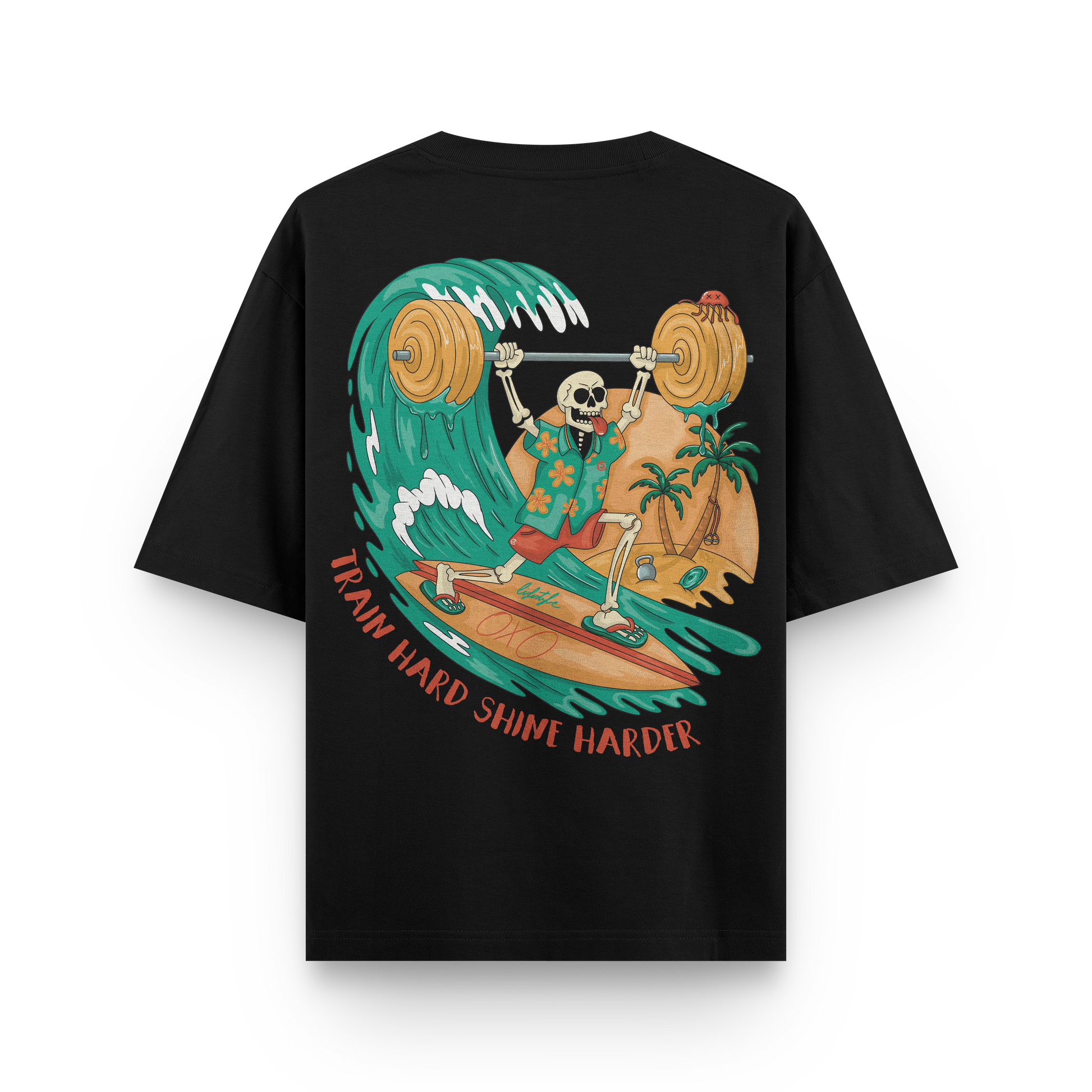 Cuando el amor por el hierro se mezcla con la vibra playera, nace TRAIN HARD SHINE HARDER: una camiseta para quienes siguen dando el 100 aunque el clima diga “relax”.