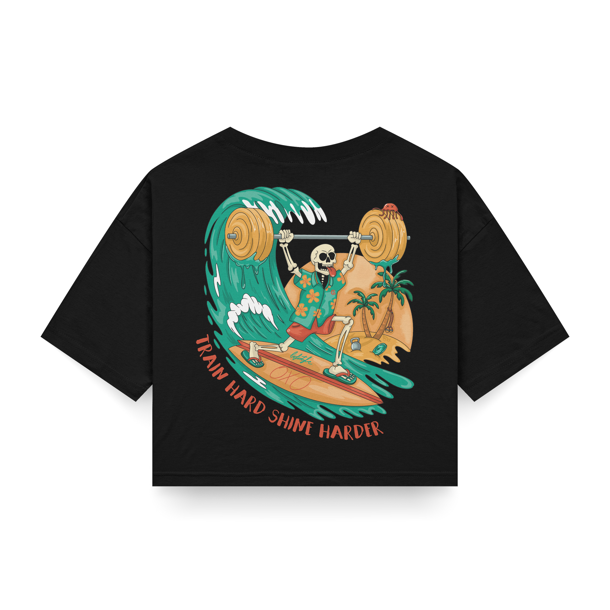 Cuando el amor por el hierro se mezcla con la vibra playera, nace TRAIN HARD SHINE HARDER: una camiseta para quienes siguen dando el 100 aunque el clima diga “relax”.